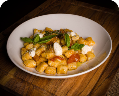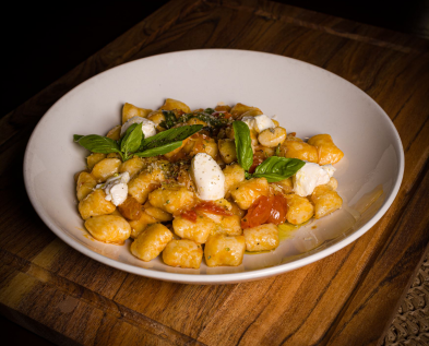 Potato gnocchi in cherry tomato confit salsa, fresh basil, buffalo mozzarella