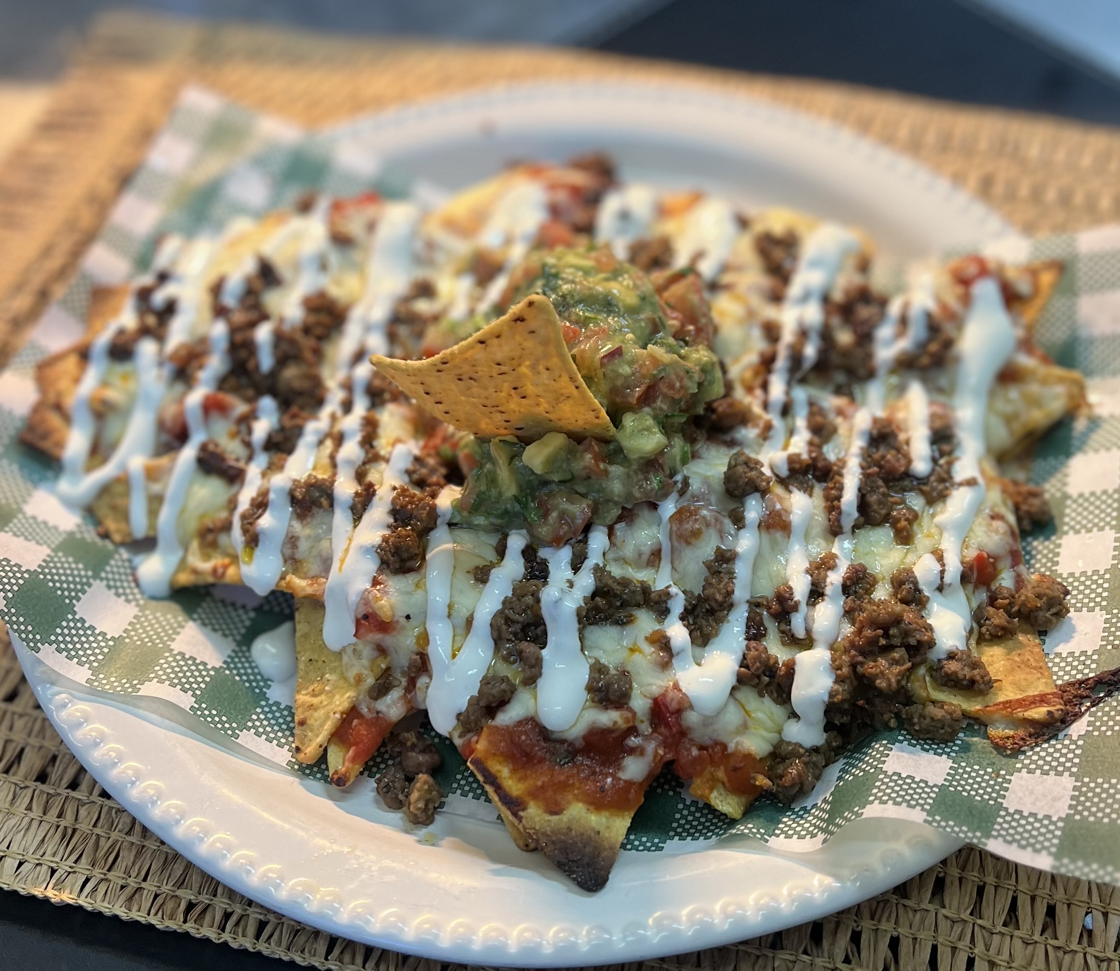 Corn Tortilla Chips, melted cheese, Fresh Guacamole, Tomato Salsa and Sour Cream.