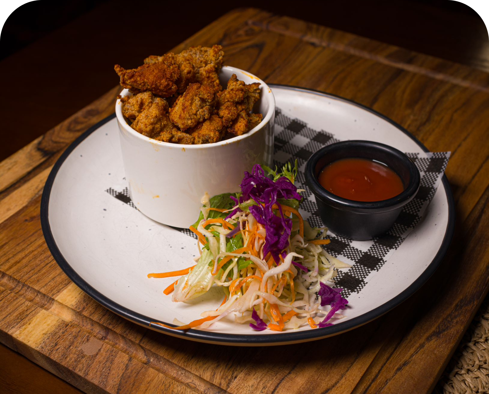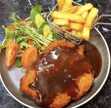 Crumbed chicken breast, fries, coleslaw salad, served with a side of gravy
